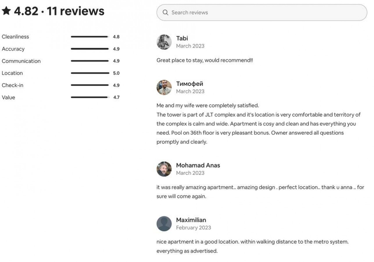 I would definitely recommend the place and will come back again. Everything was exactly the same as the pictures. Only the bathroom needs some renovation, due to the water from the shower cabin going out, which caused some inconvenience, but nothing major. The location is perfect, next to a metro station, next to Carrefour and Almaya 24/7 shops. The Marina is located just on the opposite side of the road, which was convenient to be crossed via the metro station. As a guest, I'll advise the host to clean the couch and its pillows and provide more forks and knives. Everything else was very good :)