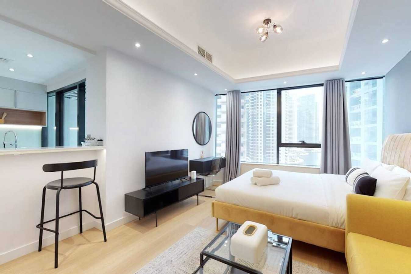 Good view, nice location, Clean ( just found dust on the shelves in the cupboard and the balcony table and the clothes dryer), nice bed except the pillows looks rickety, the bathroom is nice, the kitchen is clean but need more equipments ( the current equipments not bad), close from the metro 6 min walking, the balcony is nice but definitely no one can stay there as the AC unite is very loud without any covering for that external unite and was dropping water, the man who work on the rooftop for the gym and swimming pool must be nicer when talking to the people, upon check in I had to wait for a while with the security team and after waiting I asked them why I am waiting they told me you can go up!! I asked them why no one said anything as I thought you still doing your procedures and I was waiting for you to tell me where is the elevator and the key or that I can go up!!! Overall the stay was nice and the apartment is good and once I was ask the host about anything she was helpful.
